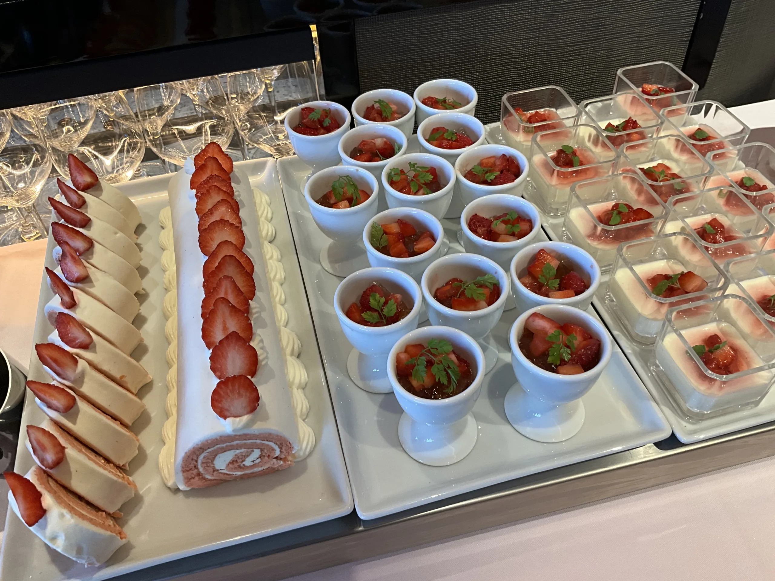 ランチタイムに「あまおう」を使ったデザートビュッフェを開催。いちごの果実をそのまま味わえるのはもちろん、エクレア、タルト、ロールケーキなどホテルパティシエの小野寺美江子さん特製のいちごのデザートを心ゆくまで味わえる。自分で盛り付けるコーナーもあり、たっぷりシロップを染み込ませた甘くてふわふわと柔らかい「ババ」がおすすめ。