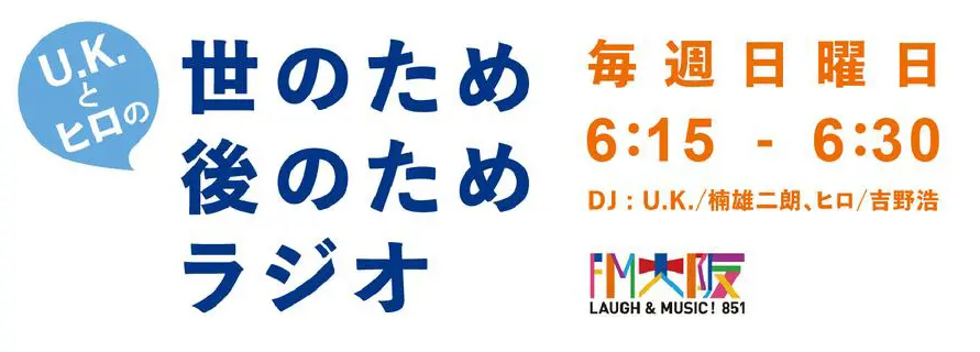 FM大阪で毎週日曜6時15分から、ヒロさんとラジオDJでタレントのU.K.さんで「世のため後のためラジオ」を放送中!