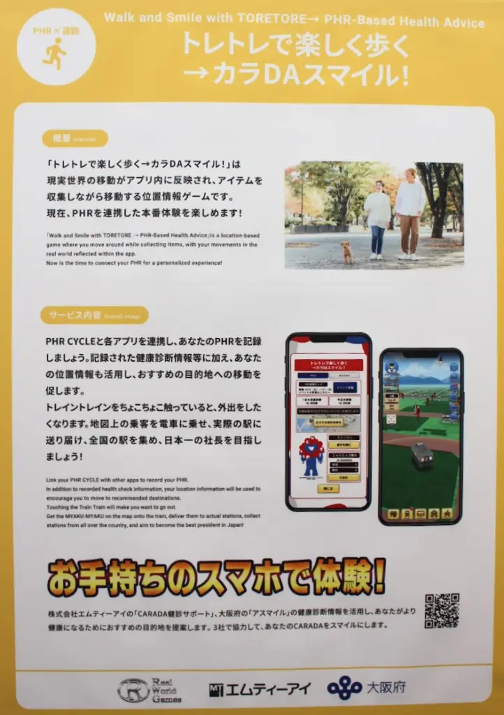 現実世界の移動がアプリ内に反映され、アイテムを収集しながら移動する位置情報ゲーム。エムティーアイの 「CARADA健診サポート」、大阪府の「アスマイル」に記録した健康診断情報等を活用し、リアルワールドゲームスのゲームアプリ「トレイントレイン」がより健康になるためのおすすめの目的地を提案し、移動を促す。