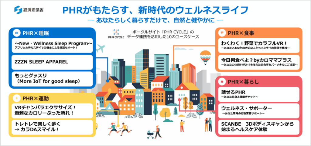 経済産業省の実証事業「令和5年度補正PHR社会実装加速化事業(情報連携基盤を介したPHRユースケースの創出に向けた課題・論点整理等調査実証事業)」に参画するサービス事業者及びPHR事業者の全20事業者がペアリングして10件のPHRサービスの展示発表と体験提供を行っている。