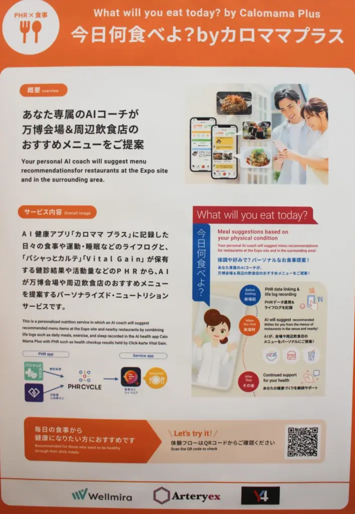 Arteryexの「パシャっとカルテ」やY4.comの「Vital Gain」に記録された健康診断結果や活動量などのPHRと、WellmiraのAI健康アプリ「カロママプラス」に記録された食事・運動・睡眠などのライフログをもとに、万博会場や周辺飲食店のおすすめメニューから、個人に合った食事メニューをAIが提案する。