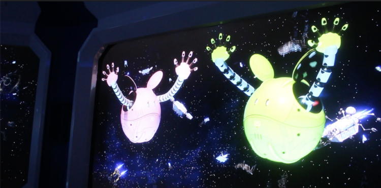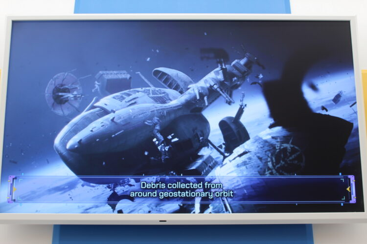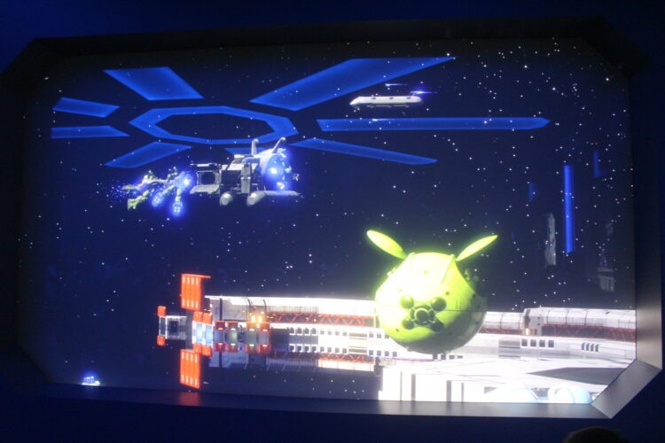 そんな軌道エレベーターを降りると今度はかなり広い空間へ移動するが、そこはスペースジャブローの中で、ここでは前面と両サイドにあるスクリーンでスペースジャブローの船外の様子をみながら、宇宙での活動についての説明を聞く。