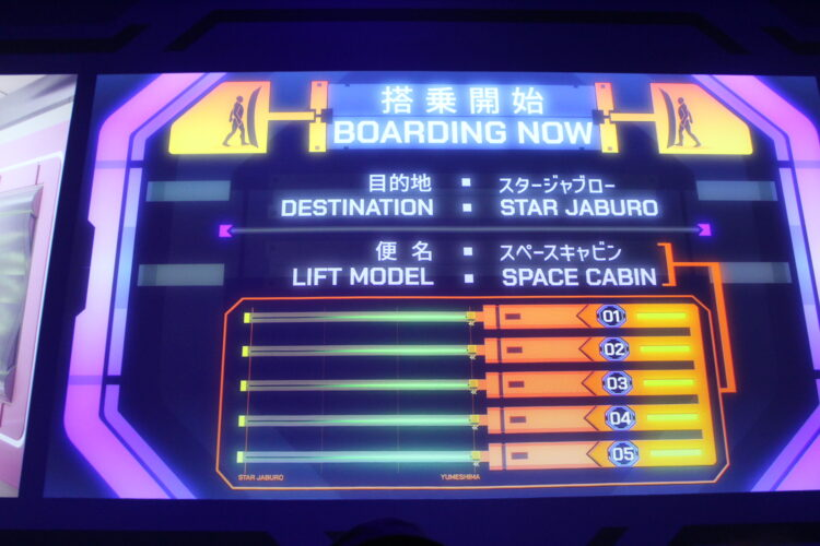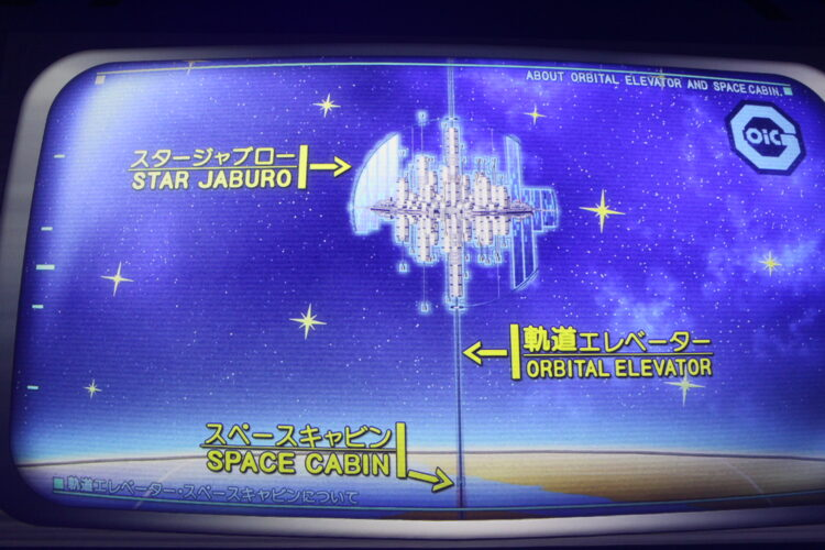 また、エレベーターは地上から発射され、高度3万6000キロに位置する宇宙ステーション、スタージャブローに到着するまでの宇宙旅行を体験するのだ。