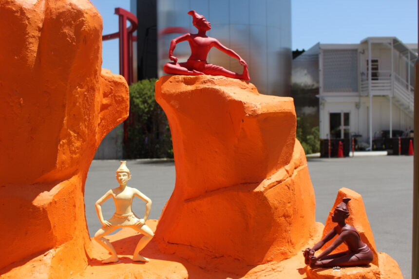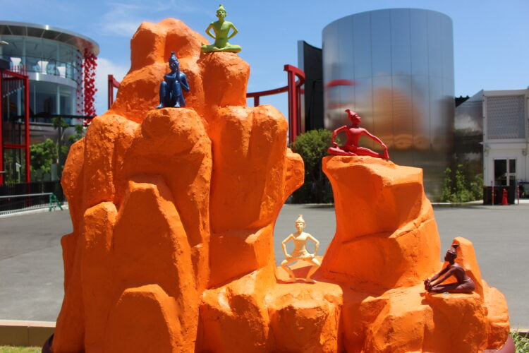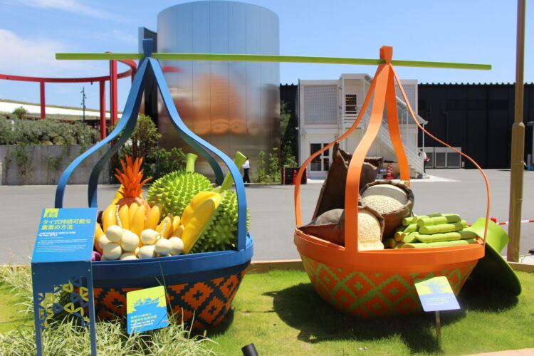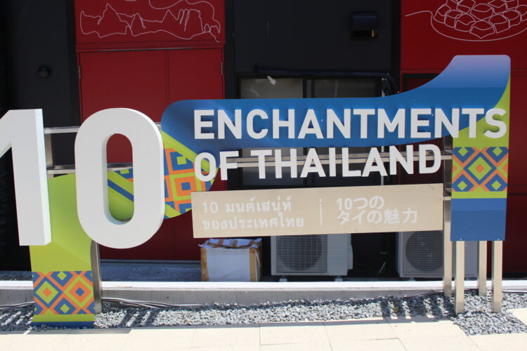 まずパビリオンの中に入る前に、建物に向かって左側(パビリオンの出口を出ると通る通路部分)には「タイの10の魅力」と称して、大きなオブジェが並んでいる。