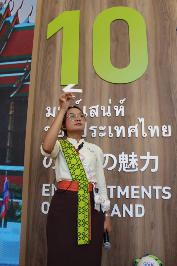 パビリオンに入ると、そこはロビースペースになっていて、100人近い人が一つのグループになって、スタッフの説明を聞く。日英両方の言語を交えた説明で、挨拶に使うタイ語の紹介や、みんなで声を出して「サワッティ」などの練習をしたりと和やかな雰囲気で始まった。