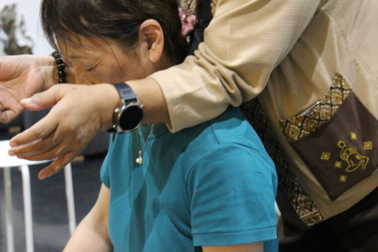 観光と健康についての紹介があった後、その隣ではタイ古式マッサージの無料体験サービスを提供しているエリアがある。