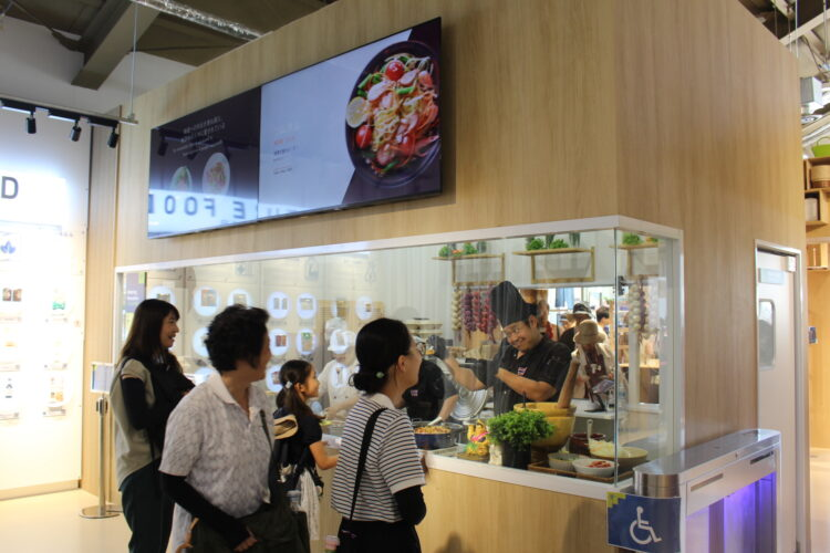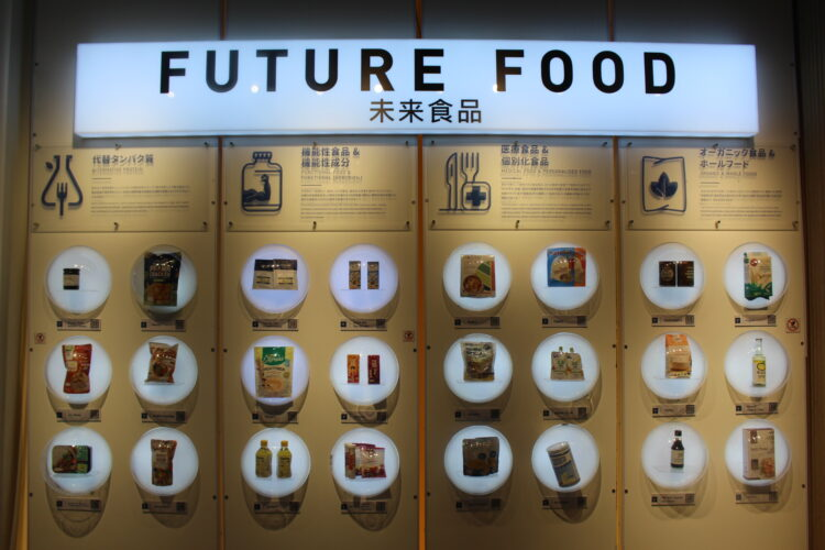 そのまま進むと「未来の料理」が登場し、代替タンパク質や機能性食品、個別化食品やオーガニック食材などのイメージサンプルが展示されている。