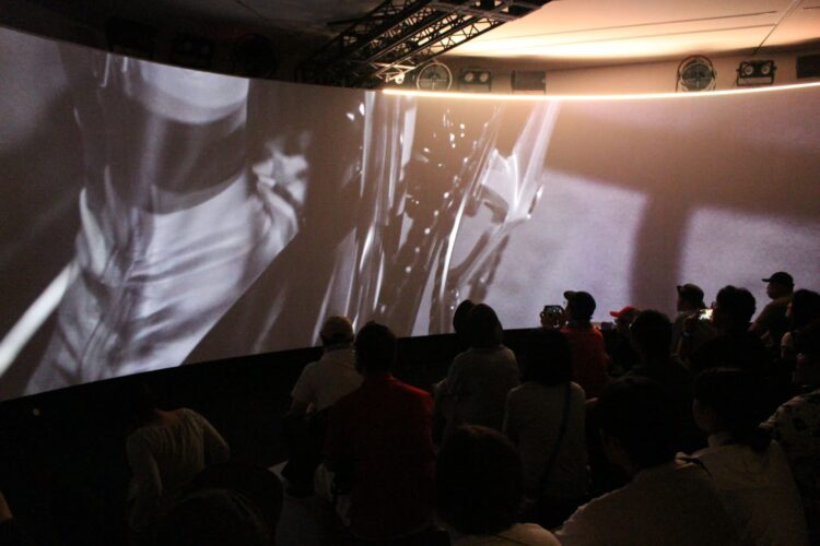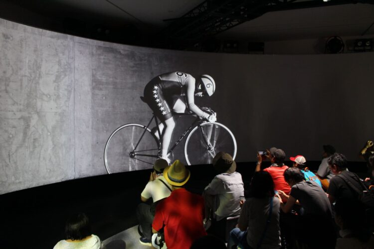 最後に見せて頂いたのは「Dynamic! ふとももシアター」で、大型の半円シアターで躍動感あふれる映像と空間演出で競輪のダイナミックさを体感できるもの。映像に合わせて流れるBGMと、そのBGMに反応するかのようなライティングで、これ以上ないくらいにカッコよく競輪の魅力を伝えていた。白黒映像から始まり、最後の1周を知らせるゴングがなった瞬間、雰囲気が変わり、カラー映像に切り替わり、音楽も照明も一気にアップビートでライブ感が沸き立つ場面になり見る者を惹きつけるような見事な演出だった。