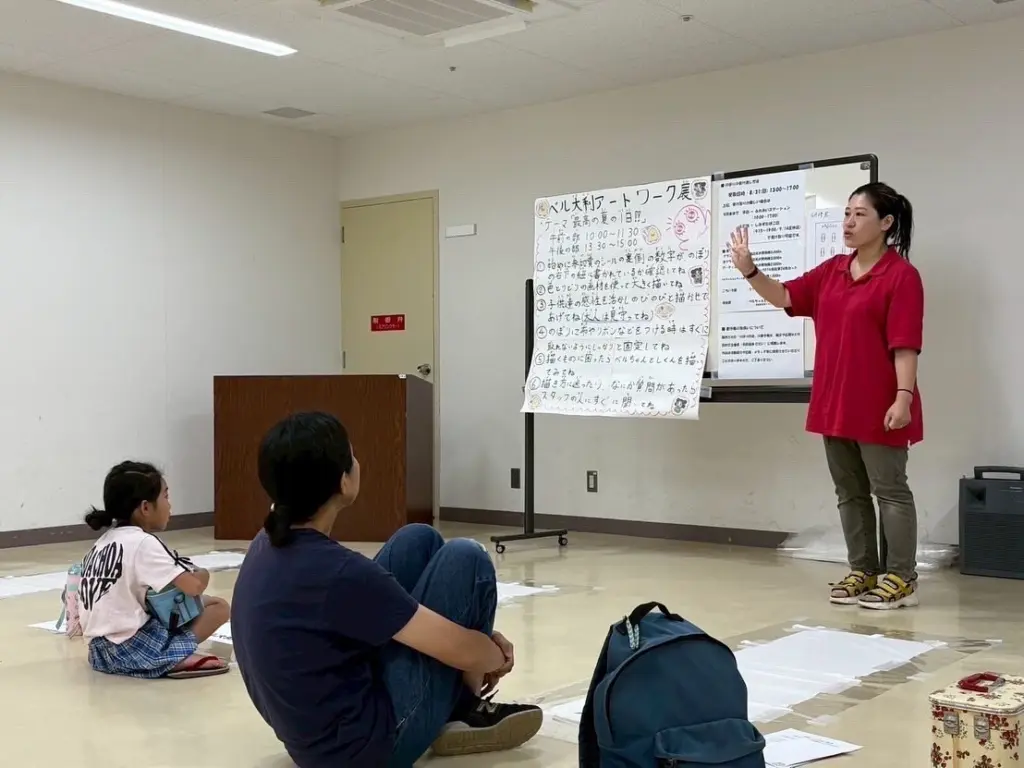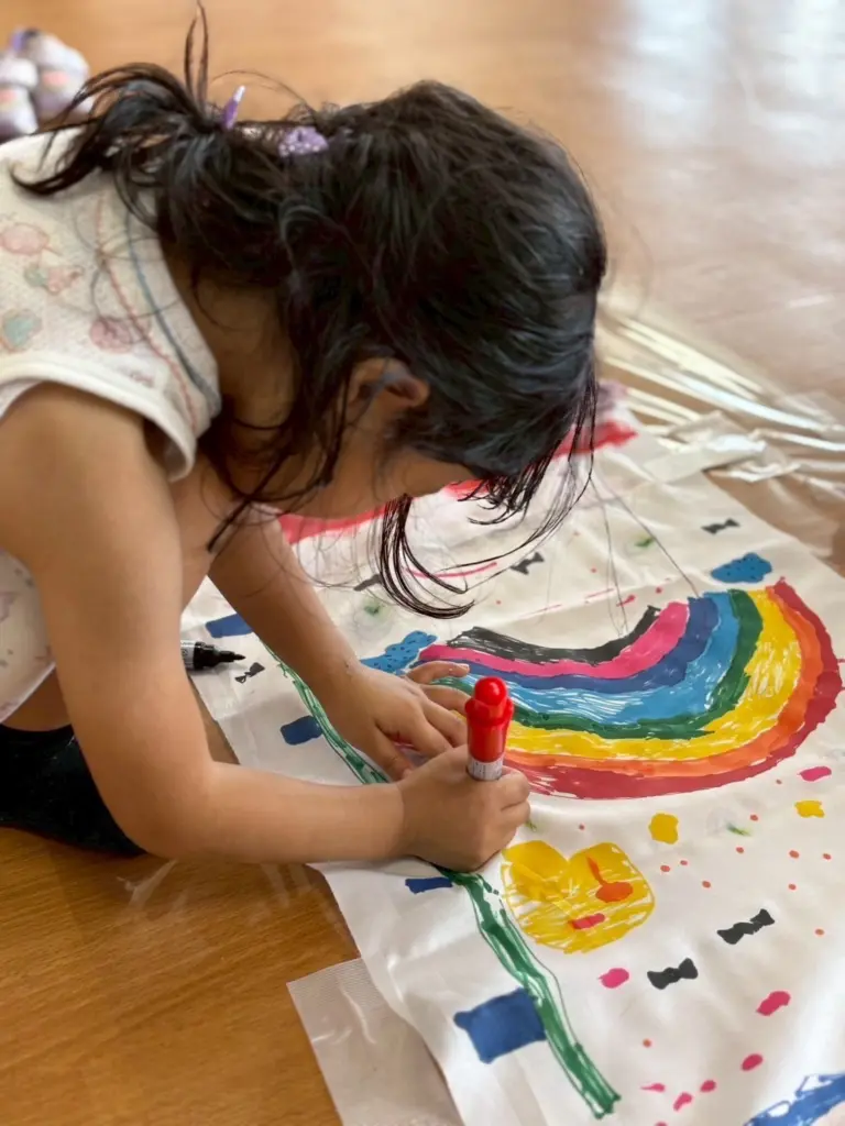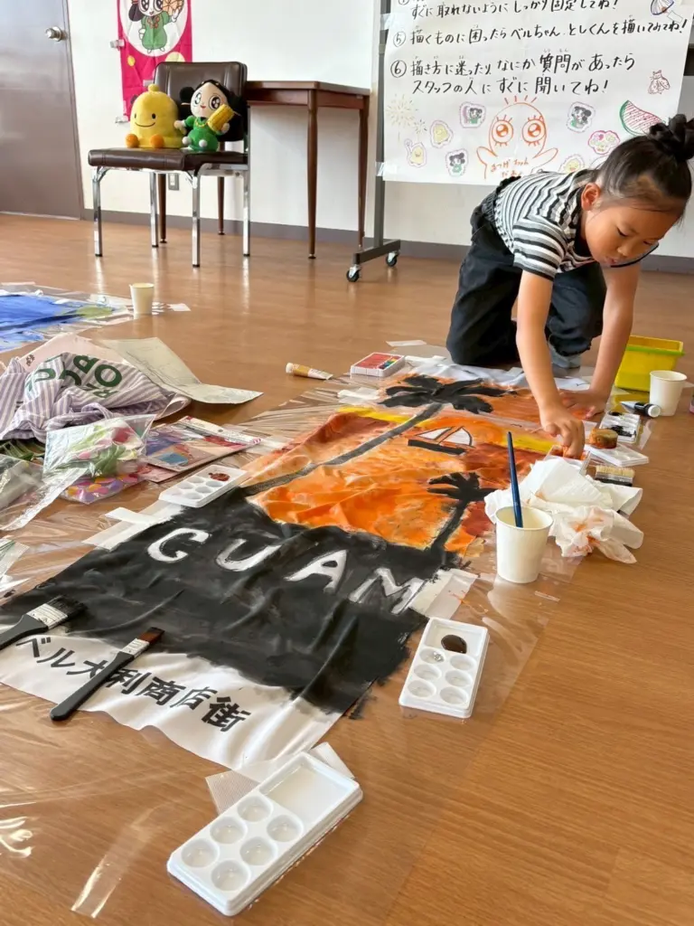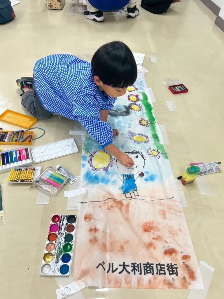 当日は2歳児から大人まで幅広い世代が参加し、のぼりに自由な発想で絵や文字を描いた。講師の説明を待ちきれずに、夢中でペンや筆を走らせる子どもたちの姿も見られ、会場は終始にぎやかな雰囲気に包まれた。
