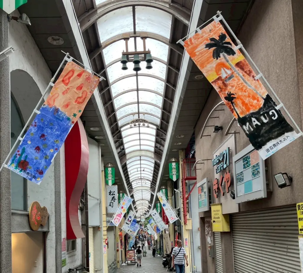 完成したおよそ50点の〝のぼりアート作品〟は、寝屋川市駅前の「ベル大利商店街」に展示されており、8月31日まで市民や買い物客の目を楽しませている。