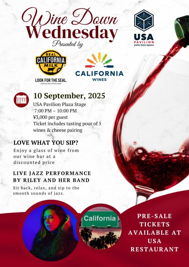 アメリカパビリオンでカリフォルニアワインの魅力を存分に味わえる「Wine Down Wednesday (ワイン・ダウン・ウェンズデー) 」が9月10日の午後7~同10時に、開催される。