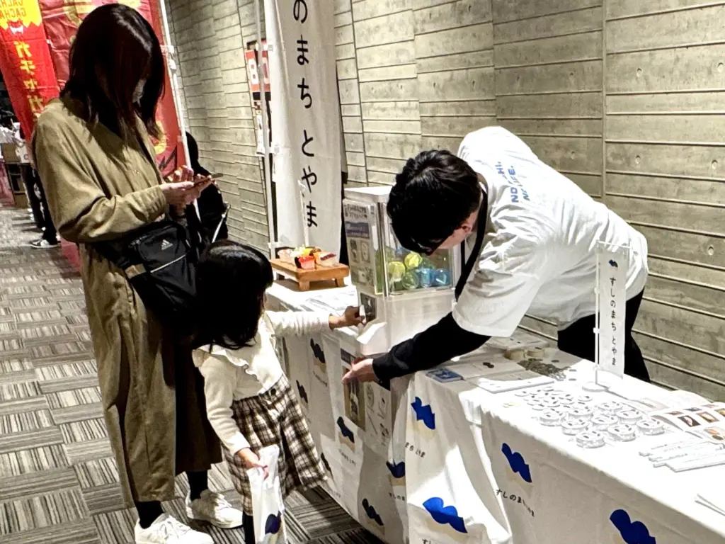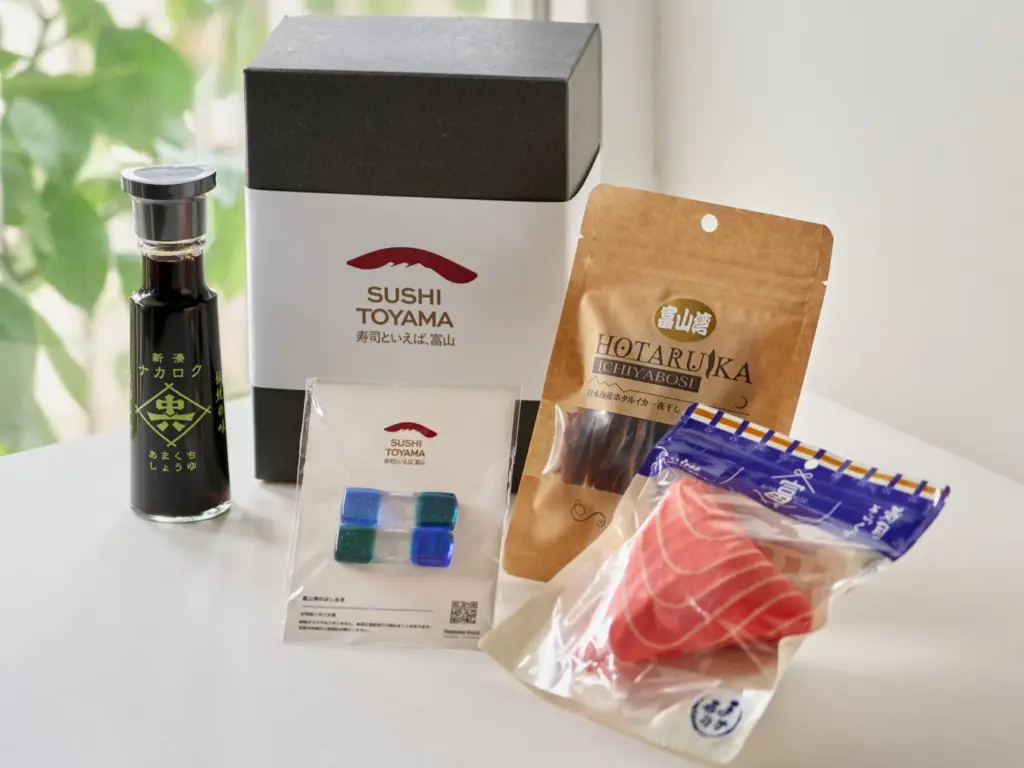 会場では「寿司といえば、富山」をテーマにしたおみやげBoxを販売。購入者には県産米「富富富(ふふふ)」のパックご飯が特典として贈られる。おみやげBoxは、富山の寿司文化を盛り上げるオンラインコミュニティ「寿司といえば富山DAO」などを通じて募った意見を基に構成され、ガラス箸置き(富山ガラス工房)やホタルイカの一夜干し(有限会社京吉)、甘口醤油(中六醸造元)、ます寿司ソックス(助野株式会社)など、富山の特色ある品々を詰め合わせた。