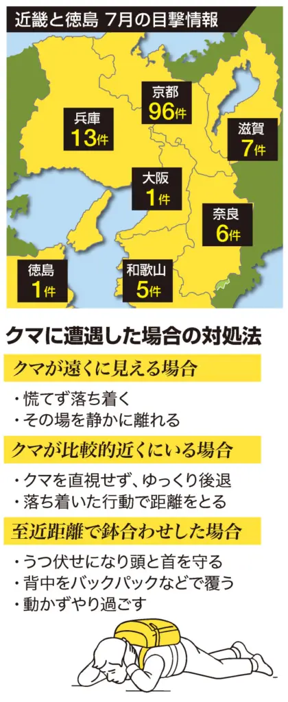 近畿と徳島の7月の目撃情報は、京都が96件と最多で、兵庫13件、滋賀7件、奈良6件、和歌山5件、大阪と徳島がそれぞれ1件だった。9月には高槻市や池田市で痕跡が確認され、豊野町では作業中の3人が大型犬ほどのクマを目撃している。