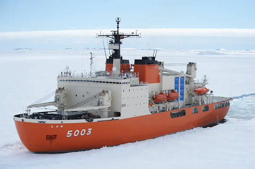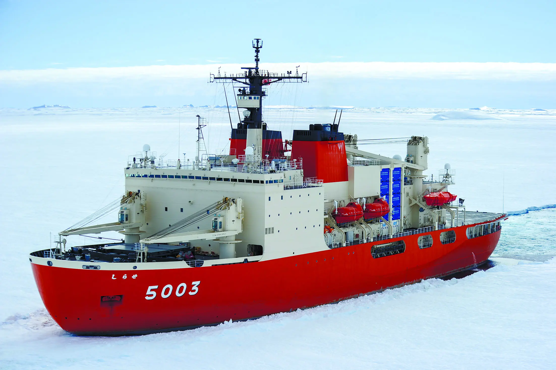 しらせは全長138㍍、幅28㍍で、基準排水量は1万2650㌧。厚さ約1.5㍍の平らな氷海域を氷を砕きながら3ノット(時速約5㌔㍍)で進める砕氷艦。氷厚が1.5㍍以上になるといったん200~300㍍後退し、最大馬力で体当たりして氷に乗り上げ、艦の重さで砕く仕組みだ。