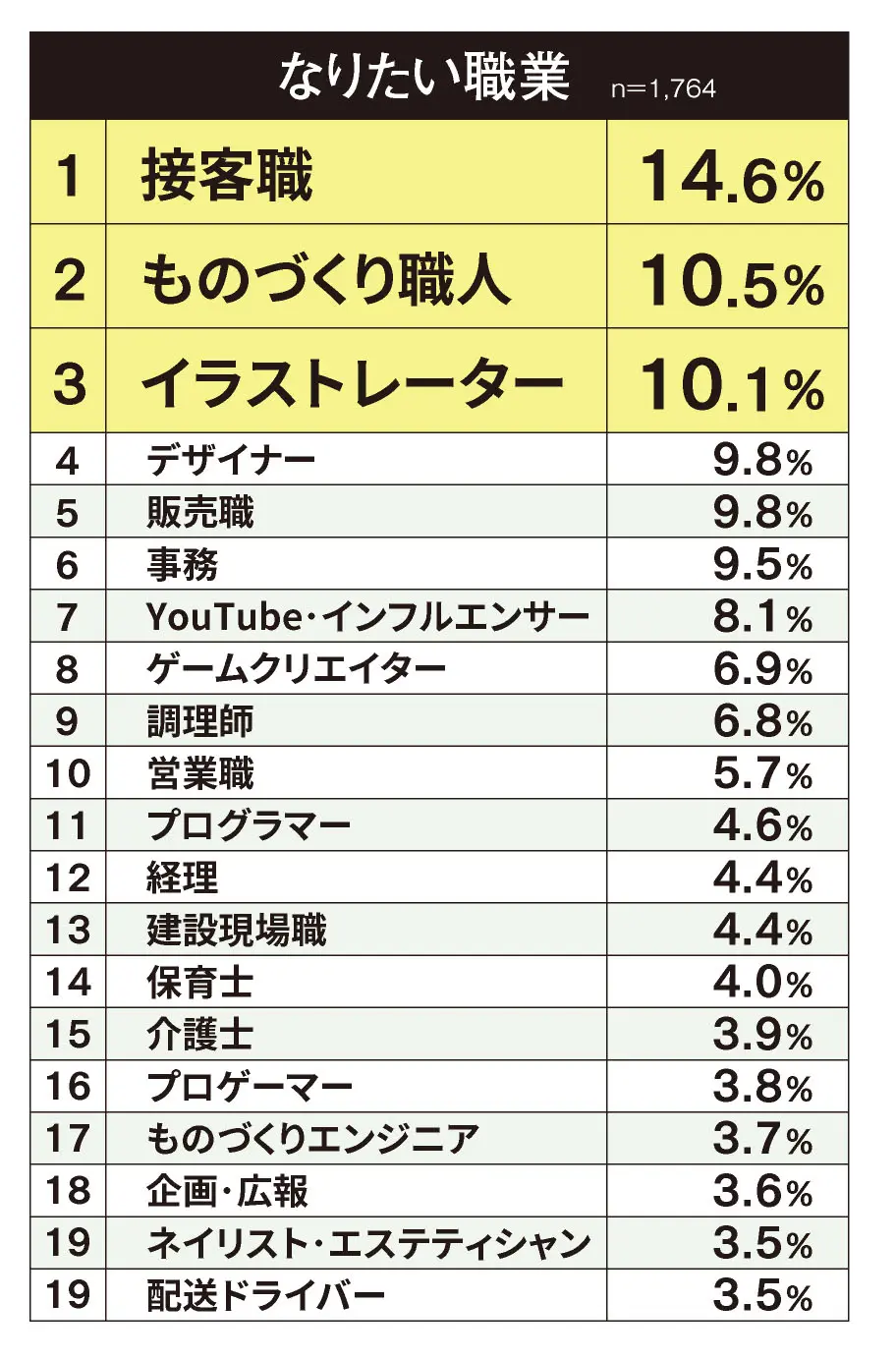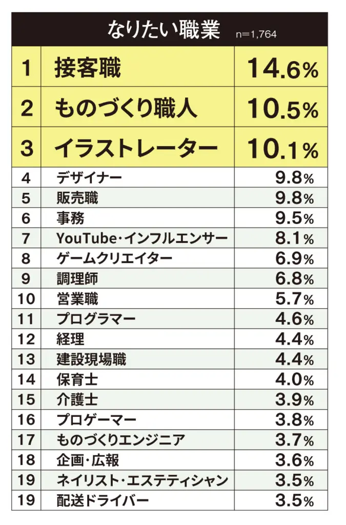 安定×自己表現が鍵 高校生のなりたい職業1位「接客職」 2025.10.09 高校生向け就職支援を行うジンジブ(大阪市中央区)は、全国の職業体験イベントに参加した現役高校生1746人を対象に「なりたい職業ランキング」を調査した。 1位は「接客職」(14.6%)で3年連続のトップ。2位は「ものづくり職人」(10.5%)、3位は「イラストレーター」(10.1%)となった。 同社は「高校生が職業を選ぶ際の軸は、アルバイトなどを通じてその職を身近に感じられるかどうかに加え、安定性への志向や、クリエイティブさ、自己表現を重視する傾向が強まっている」と分析した。