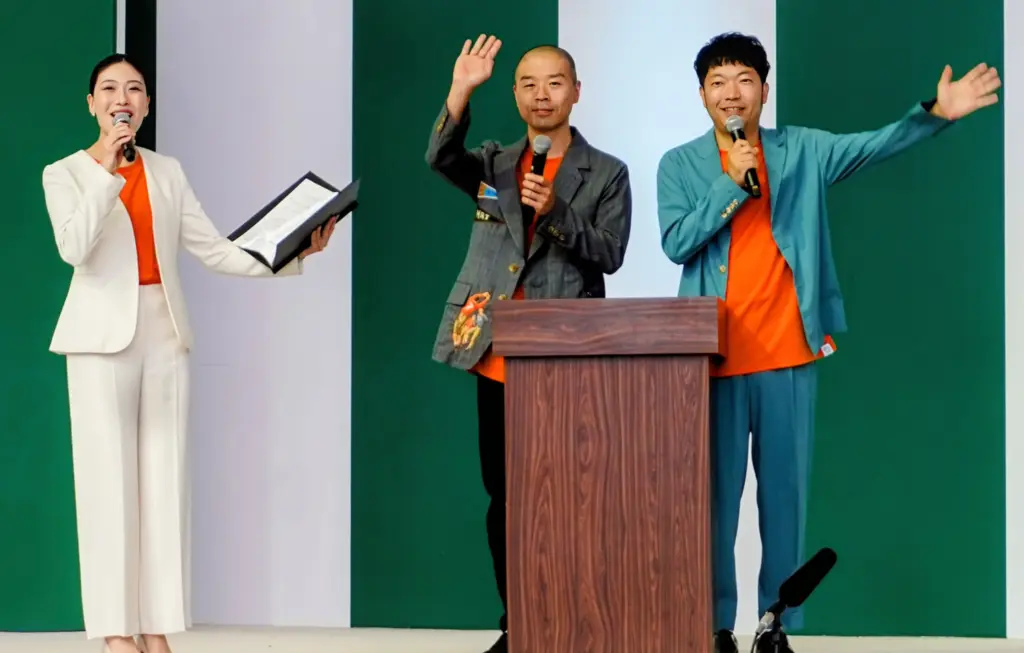 大阪・関西万博2025も閉幕に近づき「よしもとwaraiimyraii館」で展示されていた現代アート〝問いかけられるネギ〟(高さ4㍍、前長8㍍)が13日の会期終了後、公開コンペで応募があった中から特産品・下仁田ネギで知られる群馬県下仁田町に寄贈される事になり、閉幕を前に同館を運営する吉本興業HDの泉正隆副社長から岩崎正春町長に譲渡式が行われた。
