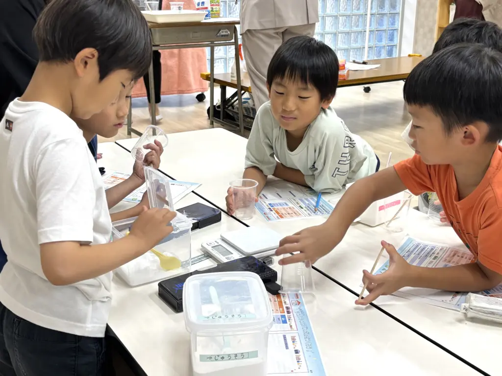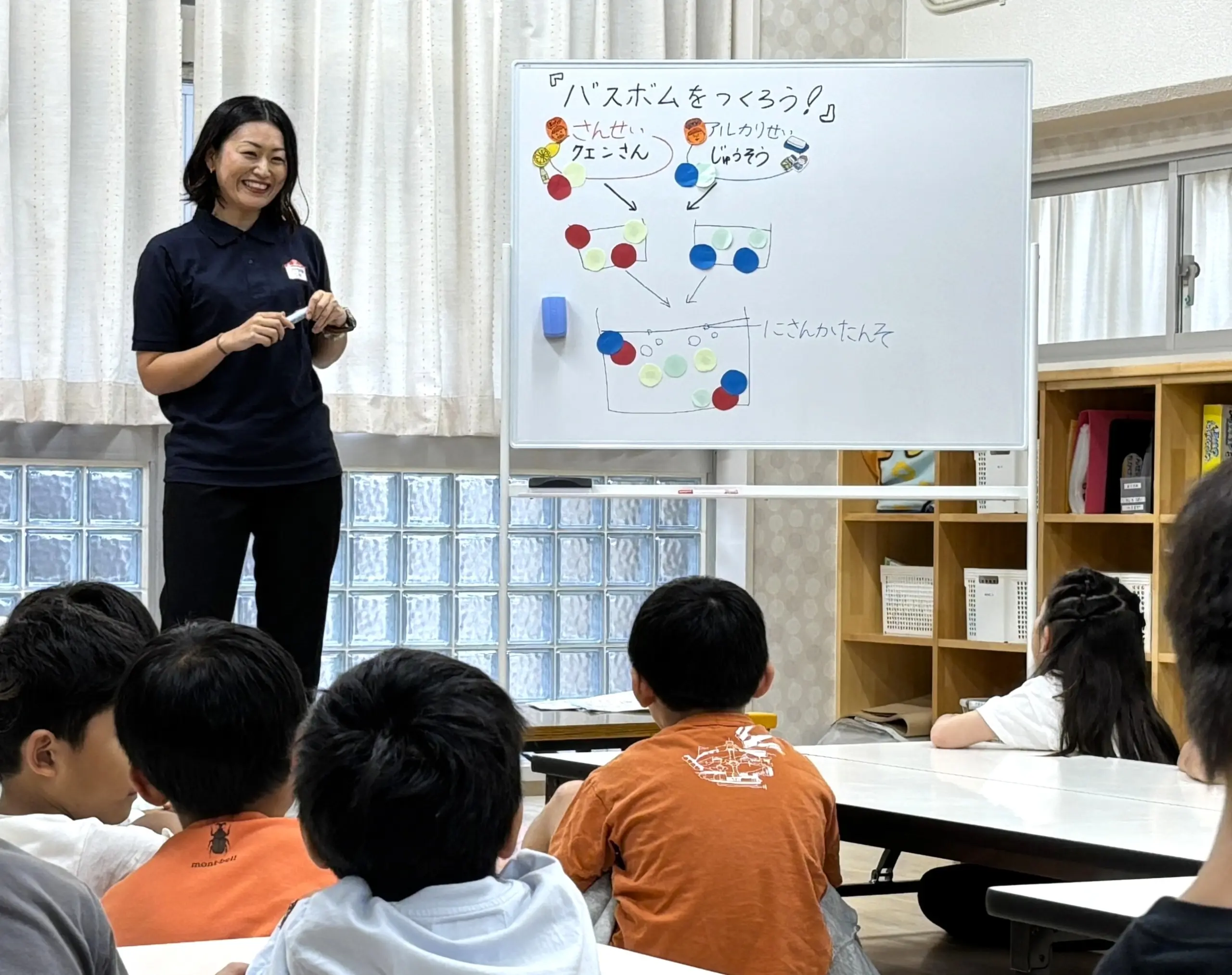 この日は理科受験教室などを運営する「ハマリカラボ」が講師を務め、まず子どもたちに「入浴剤をお湯に入れるとどうなるかな?」「なぜ泡が出るのかな?」と問いかけながら、クエン酸と重曹が反応して二酸化炭素を発生させる仕組みを学習。身近なすっぱいものや苦いものを挙げる場面では、多くの子どもが手を挙げ、積極的に意見を交わした。