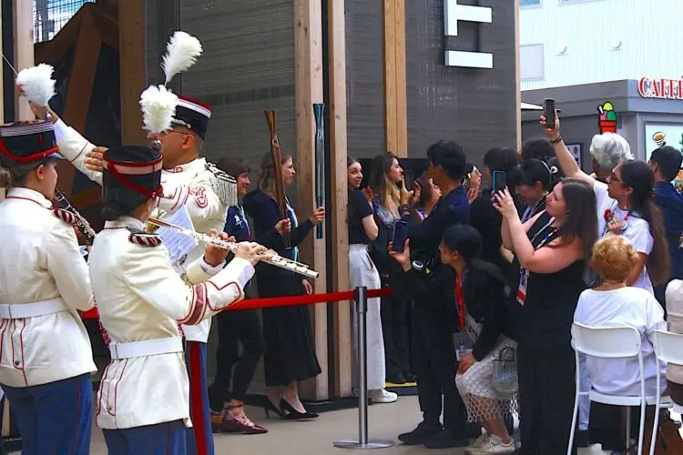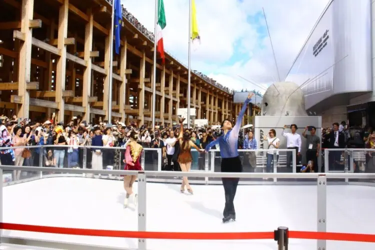大阪万博最終日、朝9時からイタリアパビリオンの前の広場にスケートリンクが登場し、館内に展示されていた2026ミラノコルティナ冬季オリンピックで使用するトーチが、オリンピック会場へ向けて旅立った。