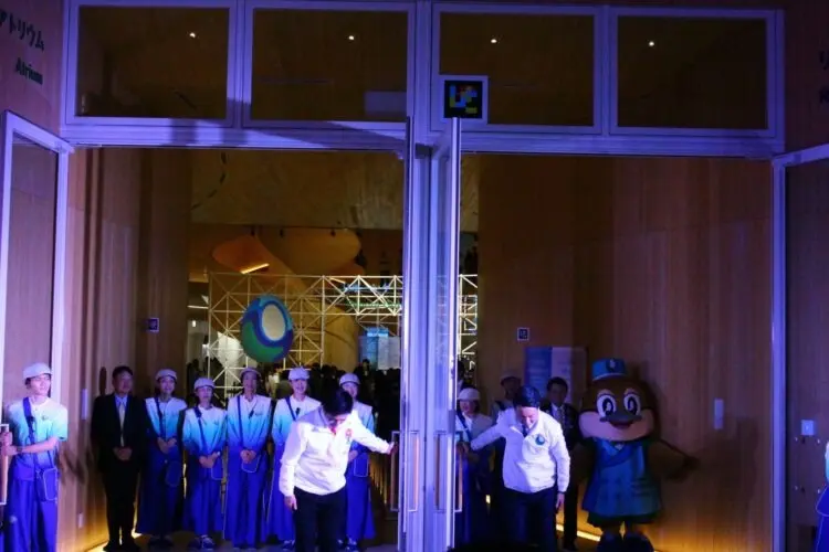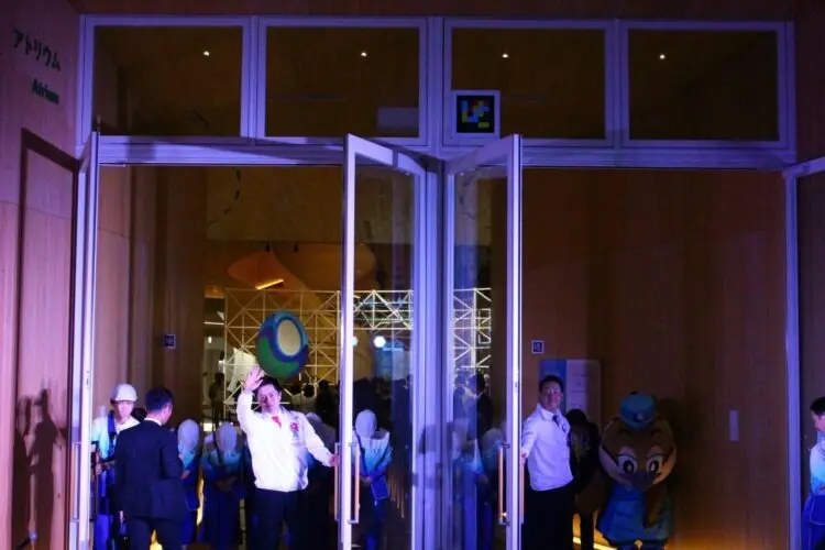 午後9時には、最後の来館者40人が吉村知事らに迎えられて館内へ入っていき、最後のドアが閉じられた。