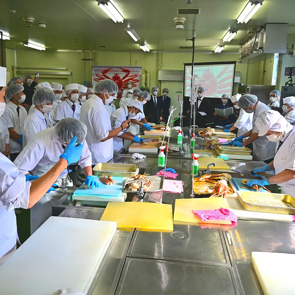 大会は1994年に始まり、今年で31回目。全40店舗で行われた予選会を経て、タイム上位24人が決勝に進出した。審査は、かに6肩の切り上がりを競う形式。脚の切断角度や関節部分の仕上がり、爪の割れ具合など細かく採点し、ペナルティーを含めた合計タイムで順位を決定する。