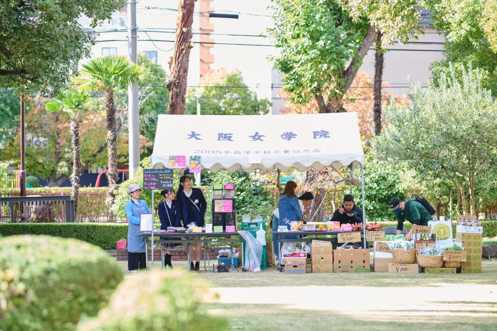 大阪女学院の芝生広場で開かれた「OJマルシェ」。生徒たちが地域の店舗と協力し、販売や接客を体験した