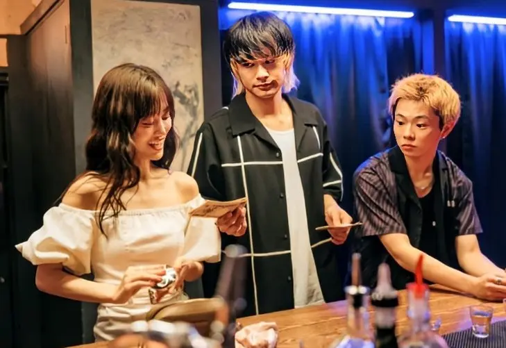協力してくれた女性に報酬を手渡すタクヤ(中央)。2人は次第に違法な世界に足を踏み込むⓒ2025映画「愚か者の身分」製作委員会