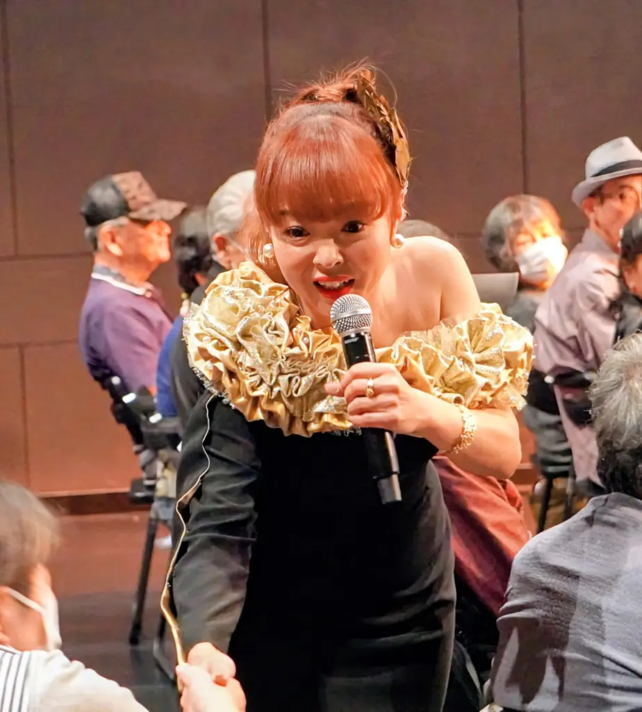 「流行歌ライブ」では、得意の「イヨマンテの夜」(1949年、伊藤久男)を熱唱。飛び抜けた高音部もきれいに出せる声楽家ならではの大迫力に客席も思わず静まり返る迫力で魅了。「声楽やっているといきなり大声や高音は全く平気なんです。この仕事を15年やってきて〝皆さんに少しずつ伝わって覚えて頂いているな〟というこの感触が好きです」と笑顔。