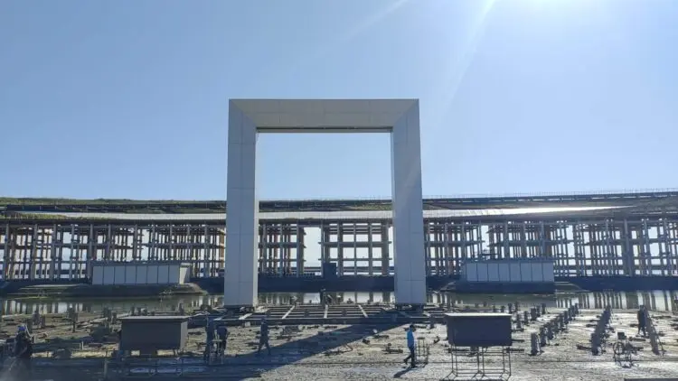 「アオと夜の虹のパレード」が行われていた大屋根リング内、南側の水面「ウォータープラザ」は既に水が抜かれていて、水面下にあった噴水装置やパイプの掃除や点検が行われていた。
