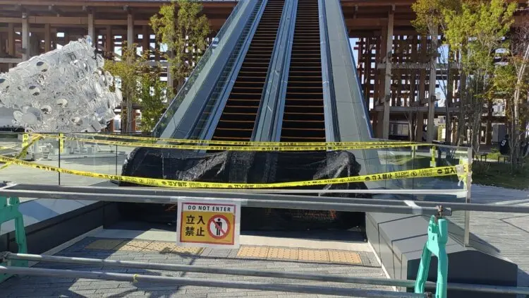 大屋根リングに登ぼるためのエレベーターも柵が設けられ通れないように。本日からはエレベーターの手を置くベルト部分に黒いシートが貼られて動かないことを強調しているかのようだった。階段の前には大きめの柵が設置されていてそちらも通ることはできない。