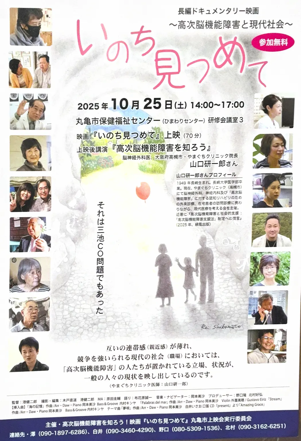 高次脳機能障害をテーマにした長編ドキュメンタリー映画『いのち見つめて~高次脳機能障害と現代社会~』の上映会と講演会が、10月25日(土)午後2時から、丸亀市保健福祉センター(ひまわりセンター)研修会議室3で開かれる。参加無料。主催は「高次脳機能障害を知ろう!映画『いのち見つめて』丸亀市上映会実行委員会」。NPO法人日本高次脳機能障害友の会が後援している。
