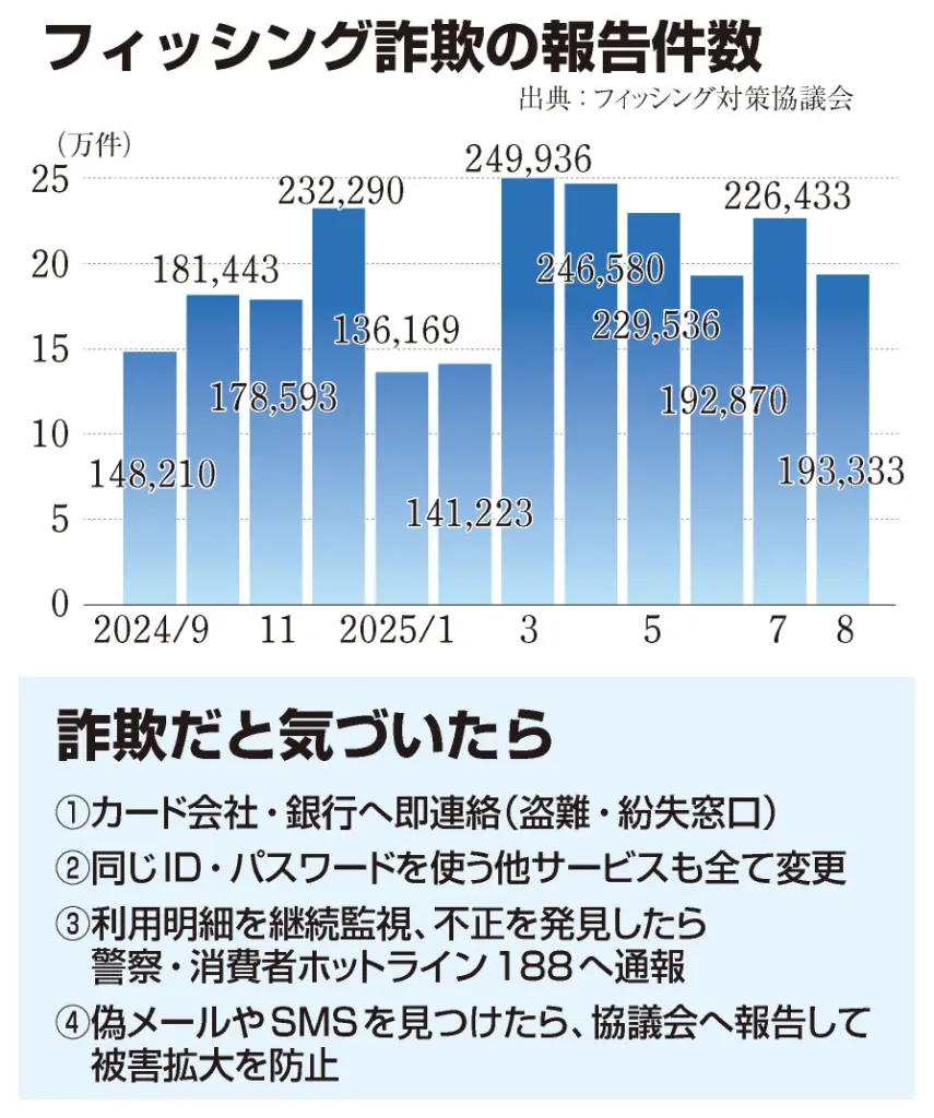 フィッシング対策協議会の報告件数は多い月で25万件近く、今年10月も19万3330件を記録。偽メールや偽ECサイト、SNS広告を通じて、利用者のID・パスワードやカード情報を盗み取る手口が確認されている。