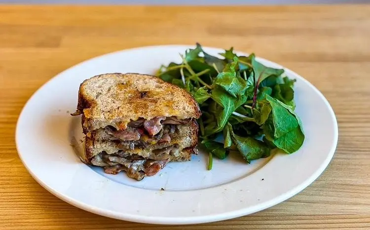 同店の看板メニューはグリルドサンドで、栄養価の高い全粒粉コンプレパンを使用。中でも「マッシュルームベーコン&トリュフ」は、季節の香りが際立つ人気メニューとして常連客から支持を集めている。
