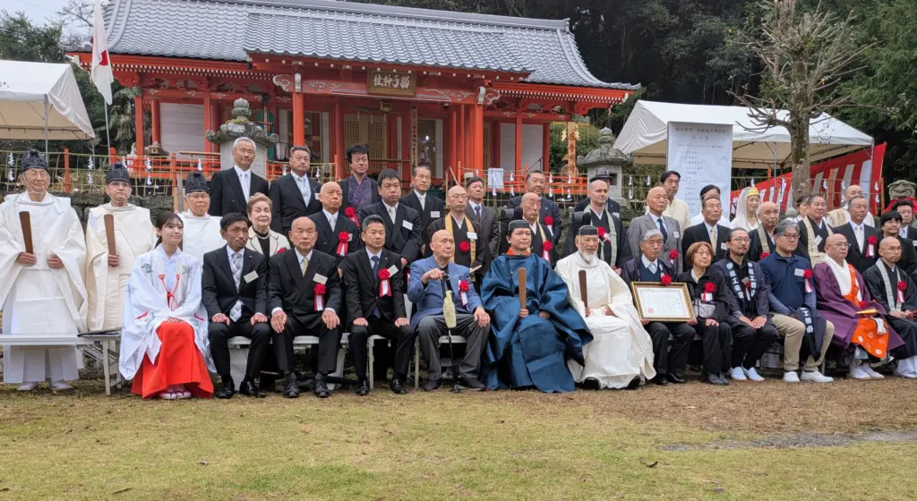 日本史を彩り、神々が宿る山里として、あがめられている奈良県・吉野山の勝手神社(佐藤一彦宮司)で26日、社殿の落成式「竣工奉告祭」が行われた。2001年に火災で焼失後、再建された社殿を前に200人が参列、よみがえった社殿に感謝し、同神社の再興を祈願。カナオカグループの一行ら、大阪から関係者50人も参列した。