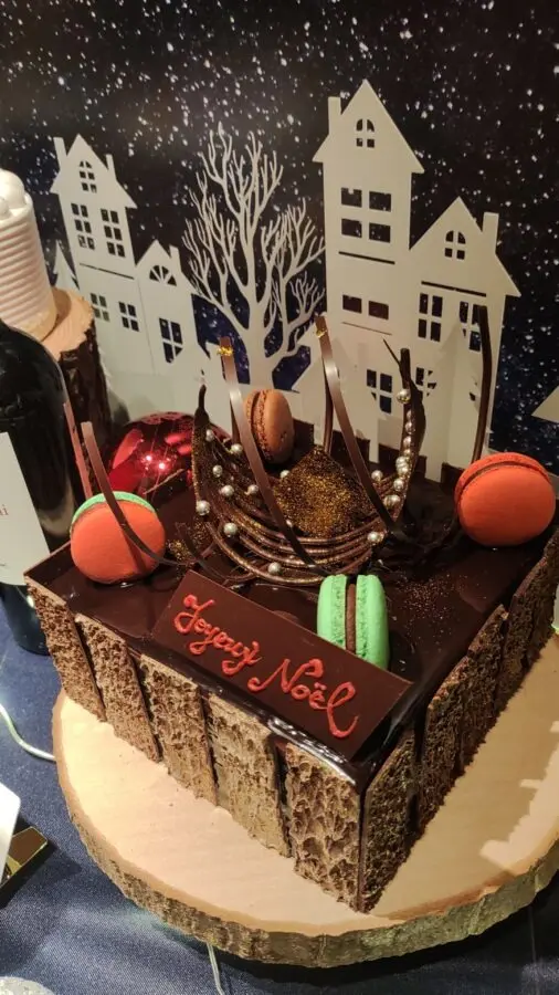 高さ7.5センチの間に、ダークガナッシュやミルクガナッシュ、キャラメルバタークリームなど全15層が最高のマリアージュを奏でる逸品。角層ごとに微妙に違う味を楽しめる。アーモンドキャラメリゼの食感がアクセント。