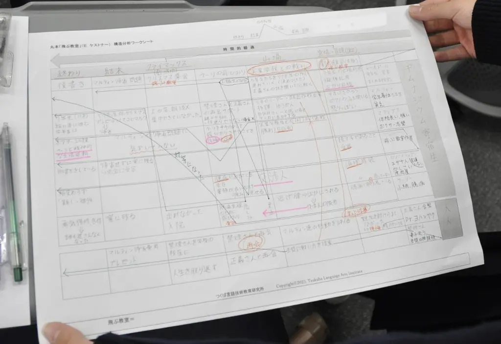 はじめに、授業を担当する篠岡副校長が「物語の全体構造をやりますよ」の一言から、物語の冒頭→発端→山場→クライマックス→結末、と物語全体の流れを把握していく。