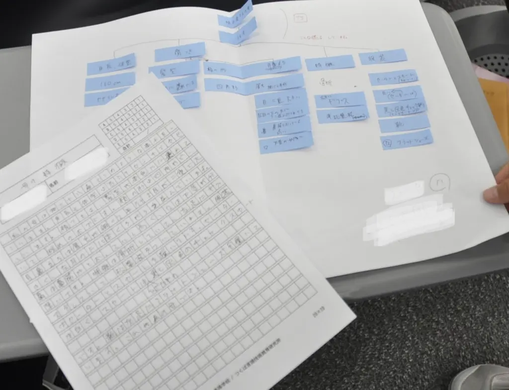 人物の大きな特徴の「僕の姉」「中3 15歳」から、身長、顔、くせ、服装と枝分かれしていく「パラグラフ」を作っていく。そして完成したパラグラフをもとに、400字詰めの原稿用紙に文章を書きこむんだ。