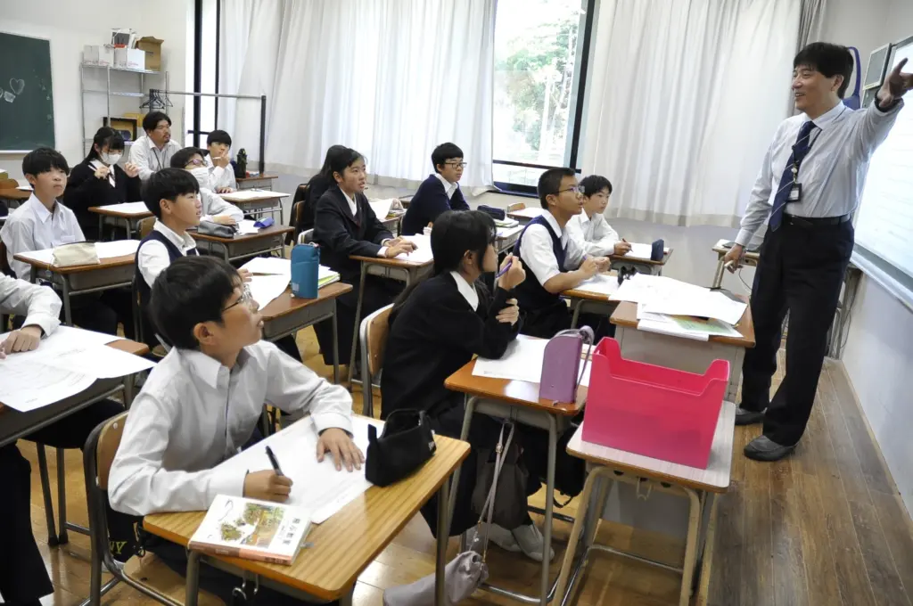 1年B組で、本を丸ごと分解する〝丸本〟授業を見学。授業で使う本「飛ぶ教室」は、ドイツの高校1年生がクリスマス休暇までに学校でお芝居をすることになり、練習の間にさまざまなトラブルが発生するという物語。