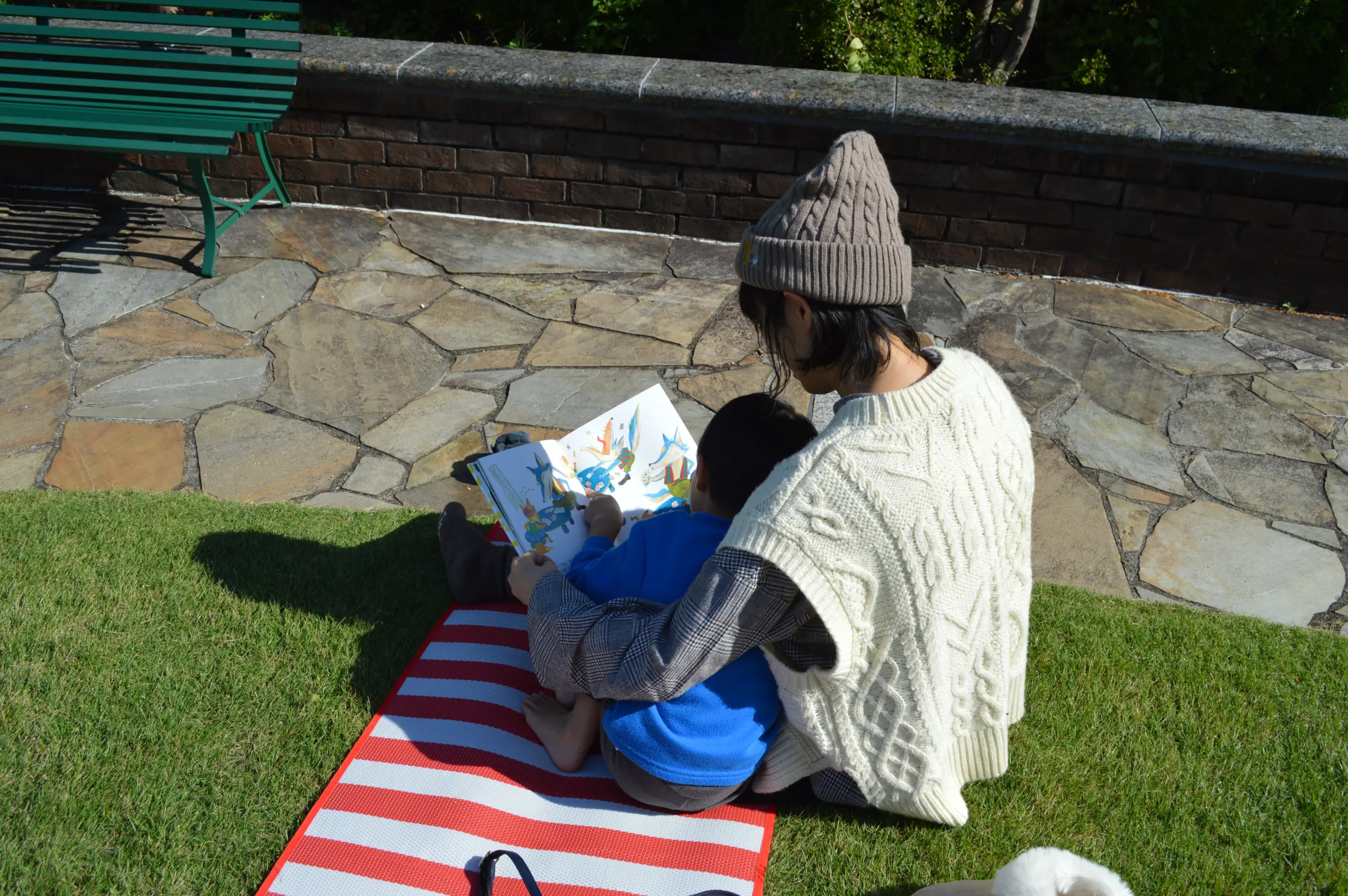 当日は学年ごとに選ばれた絵本とレジャーシートが貸し出された。親子連れが自由にガーデンの中で読書を楽しむほか、販売されているフードを購入し、ピクニックランチを楽しんでいた。