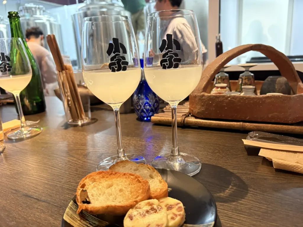店内奥にはタンクや搾り機が並び、ガラス越しに酒造りの工程を間近で見ることができる。訪れた客は、醸造家それぞれの個性が光る〝できたてのSAKE〟を立ち飲みで楽しめる。タイミングが合えば、搾りたての新作を味わうこともできるという。