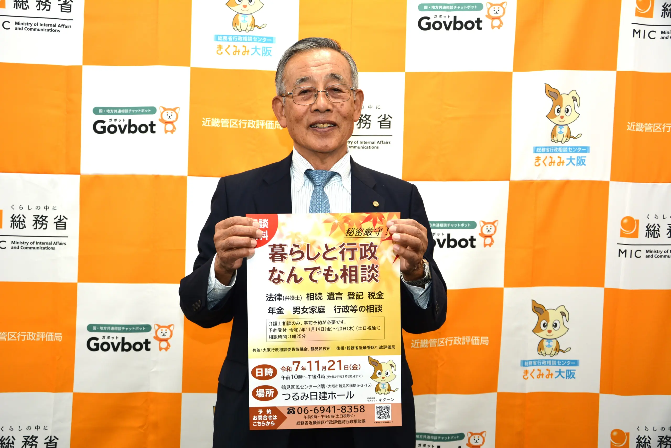 総務大臣から委嘱を受けた大阪府内の行政相談委員が、行政相談の利用を広く知ってもらおうと11月21日(午前10時~午後4時)、つるみ日建ホール(大阪市鶴見区横堤5-3-15)で、「暮らしと行政なんでも相談所」を実施する。