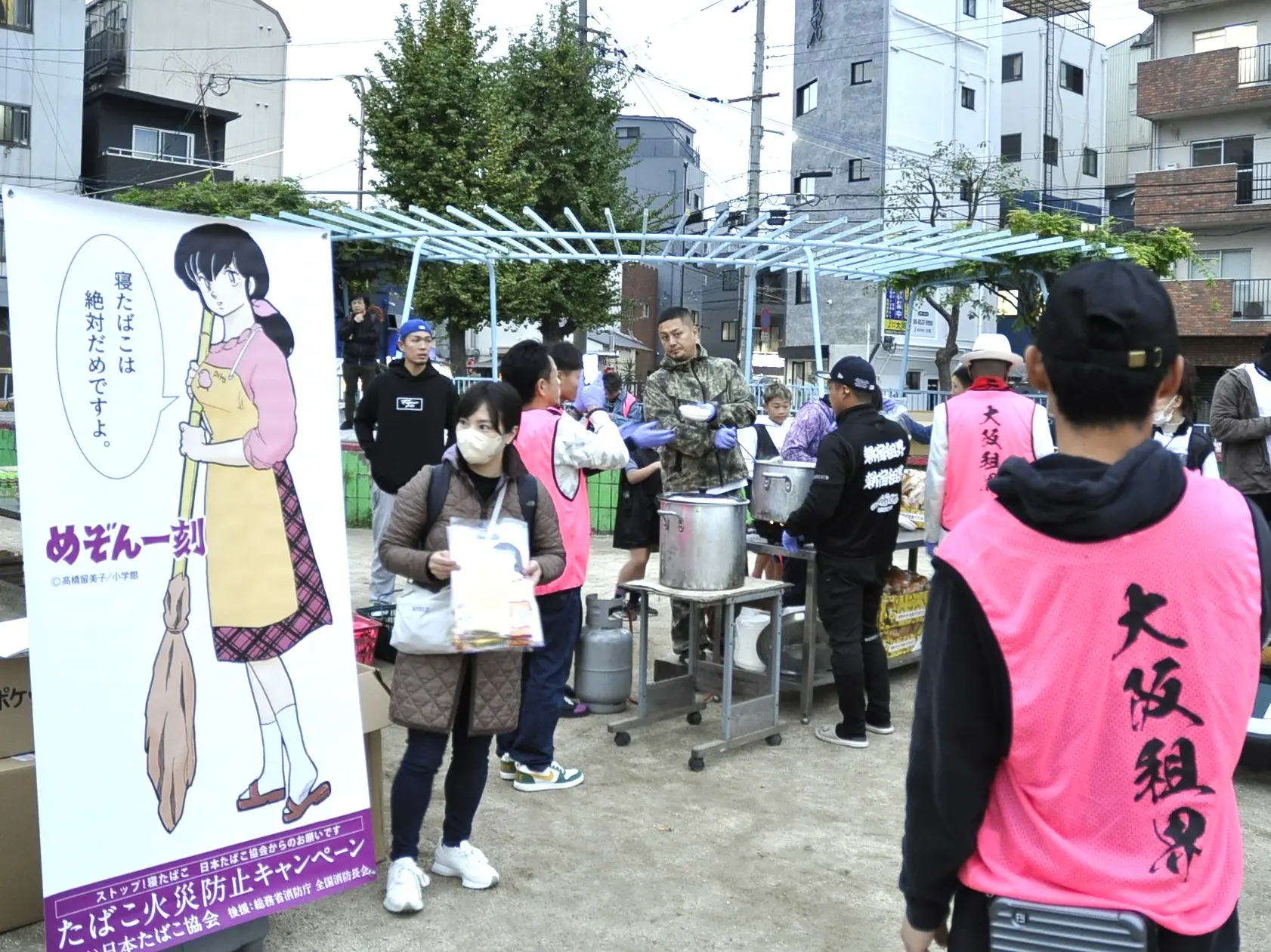 寝たばこによる火災を防ごうと、一般社団法人日本たばこ協会(TIOJ)は11月13日午後5時から、大阪市西成区の三角公園(萩之茶屋南公園)で啓発活動を行った。同所で毎週木曜に炊き出し活動を続けるダルビッシュ翔さんらのグループ「大阪租界」と協業し、来場者に注意を呼びかけた。