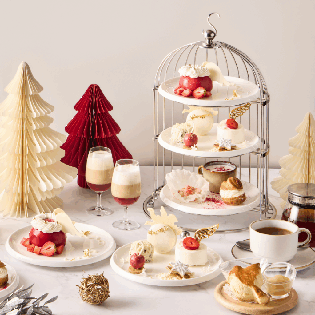 「オータム・ウィスパー(秋のささやき)」に続き、12月1日から28日までは「スノー・クリスマス」を提供。白と赤、ゴールドを基調に、天使や雪をモチーフにした華やかなスイーツやセイボリー(軽食)が並び、フェスティバルシーズンを盛り上げる。