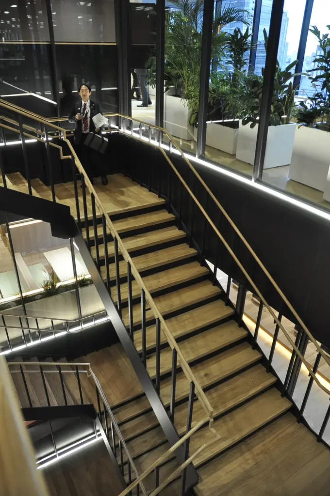 オフィスは単なる執務空間にとどまらず、イノベーション創出を意図した「オープンなオフィス環境」を前面に打ち出している。24~26階を貫く中央部は一部を吹き抜けにして2本の階段を設置。上下階を自然につなぐ2本の「連絡階段」は、移動手段であると同時にコミュニケーションスペースと一体化させ、従来のビルイン型とは一線を画す設計だ。コミュニケーションエリアは5大陸をテーマに分けられ、社員や来訪者が集い議論を交わす場を意図している。