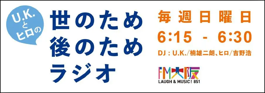 FM大阪で毎週日曜6時15分から、ヒロさんとラジオDJでタレントのU.K.さんで「世のため後のためラジオ」を放送中!