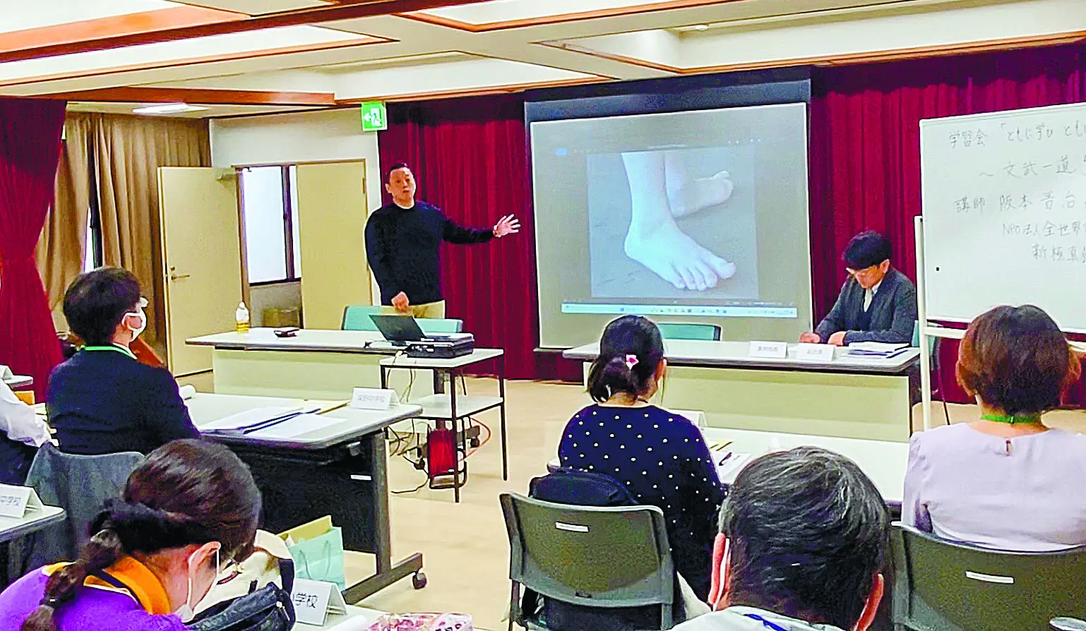 新極真会大阪東部支部の師範で、本紙コラム「文武一道」を連載する阪本晋治さんが11月18日、大東市立野崎人権文化センターで開かれた教職員向け学習会「ともに学びともに生きる」で講師を務めた。同会は、大東市の人権教育推進を目的に、教職員の学びを深める取り組みとして学習会を行っている。
