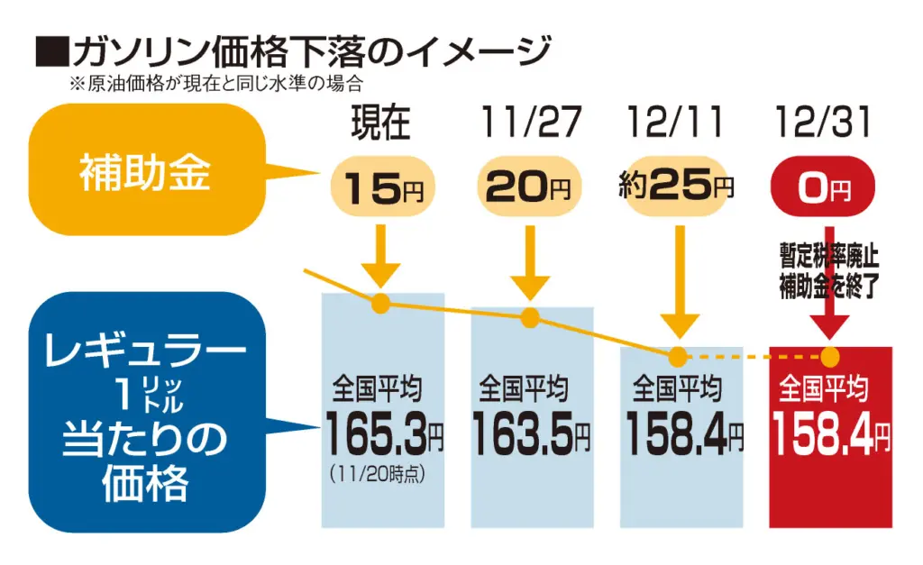 今年12月31日で廃止される「ガソリン税の暫定税率」は、道路整備などの財源確保を目的に導入され、本来のガソリン税に1㍑当たり25・1円を上乗せしてきた時限的措置だ。廃止後はこの上乗せ分がなくなるため、ガソリン価格は下がりやすくなる。
