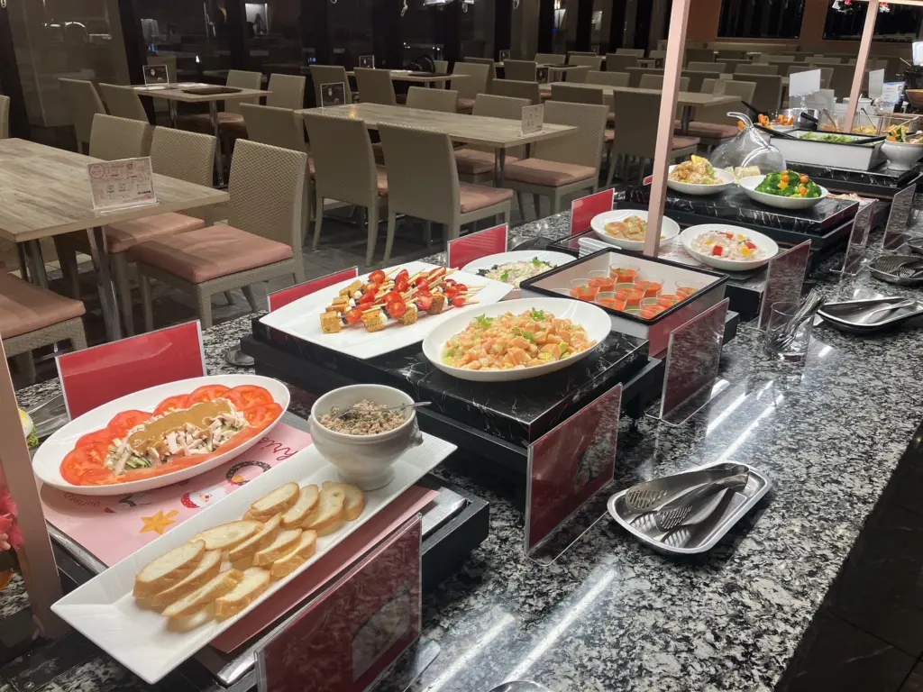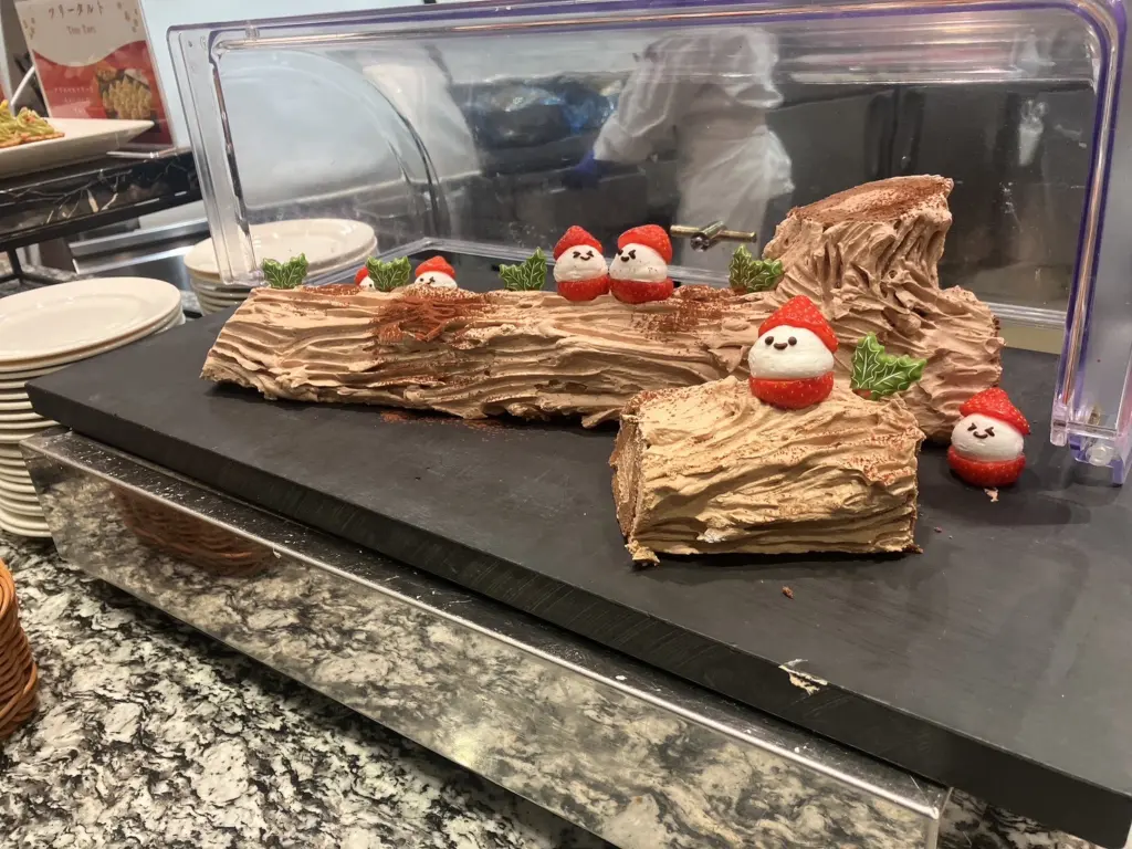 デザートコーナーには「ブッシュ・ド・ノエル」「苺のショートケーキ」「アップルパイ」「ベリームース」「抹茶ティラミス」「ナッツタルト」「チョコムース」などが並び、手をかざすだけで焼ける自動パンケーキマシンも設置。焼きたてパンケーキを自分好みにカスタムできる体験が人気だ。