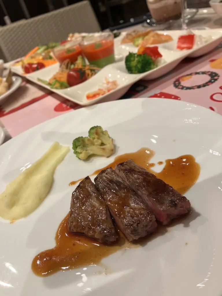 ライブキッチンでは、目の前で仕上げる「ビーフステーキ」が人気を集め、「天ぷら」「握り寿司」、サンタの飾り寿司なども並ぶ。