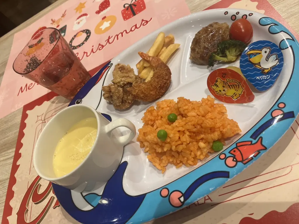 お子さまコーナーには「唐揚げ」「フライドポテト」「海老フライ」「チキンライス」「ミニハンバーグ」など、子どもに人気のメニューも。低めのカウンターにカラフルなプレートがそろい、家族で楽しめる空間になっている。