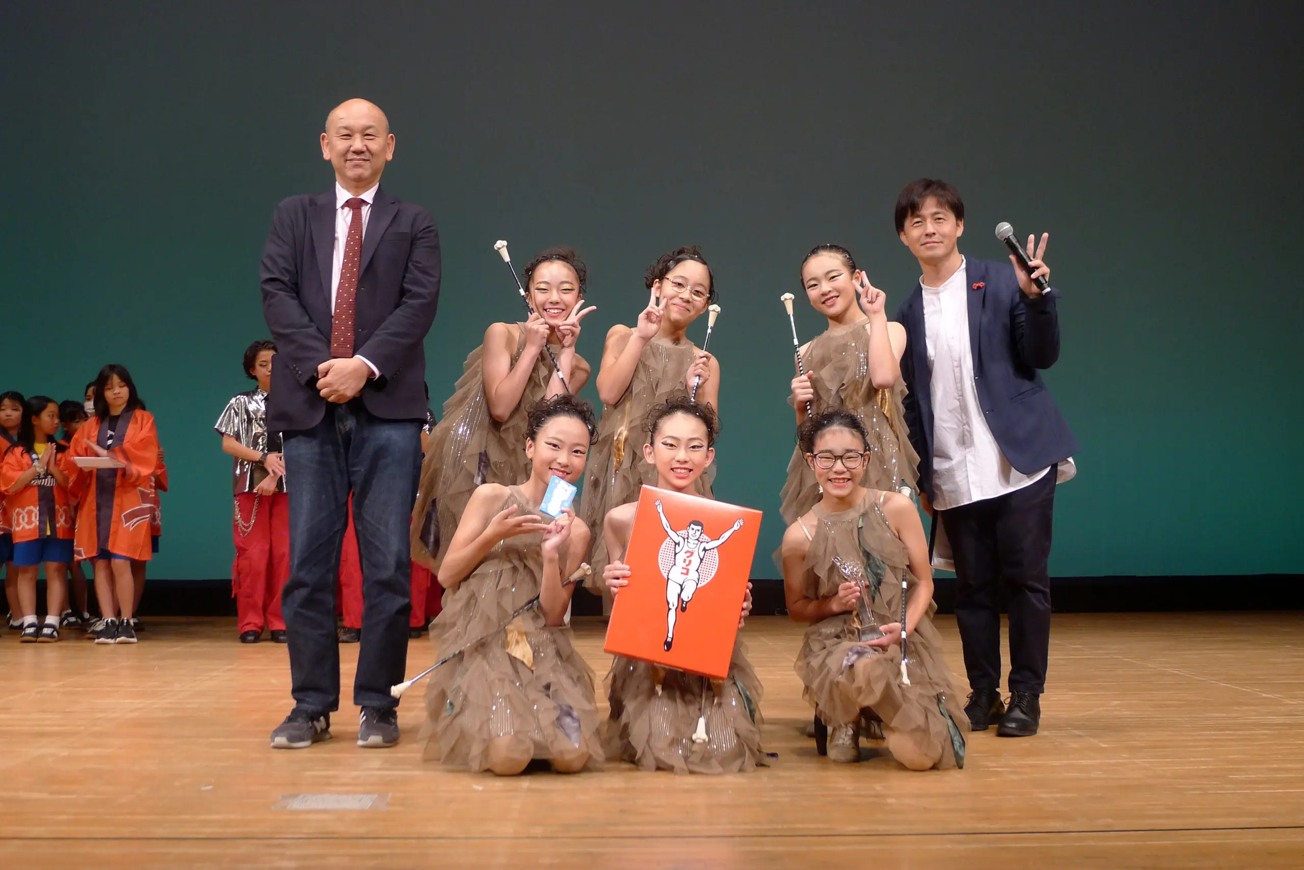 ステージで記念撮影。熱気に包まれた会場の様子。後列左端は長元さん